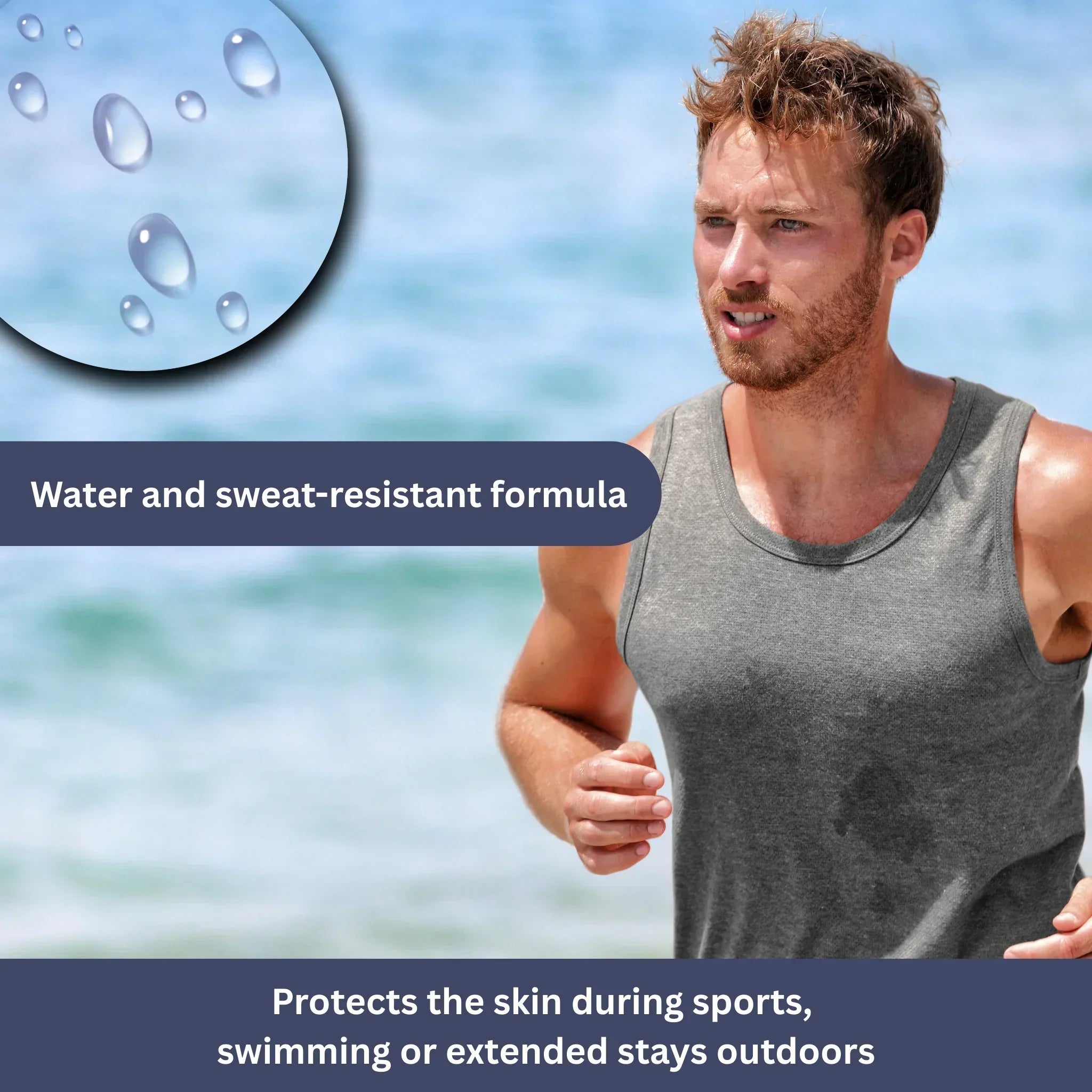 The water- and sweat-resistant formula protects your skin during sports, swimming, or extended outdoor activities.