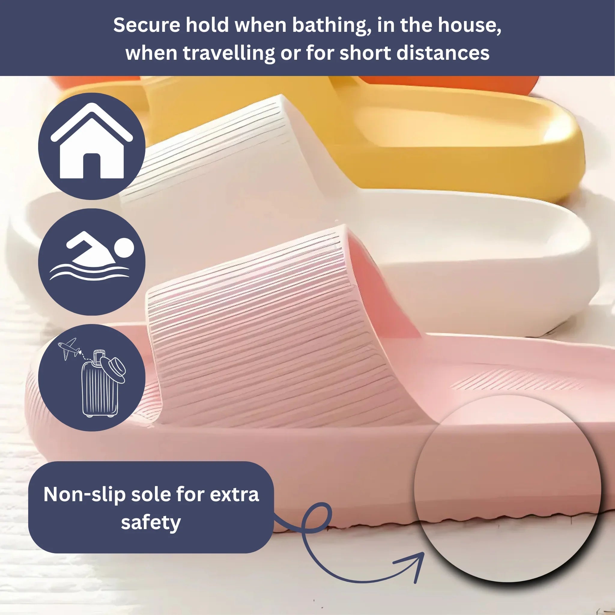 Whether bathing, at home, traveling, or for short trips, the Cloud Cushion Slippers provide secure footing and remain comfortable to wear thanks to their non-slip sole.