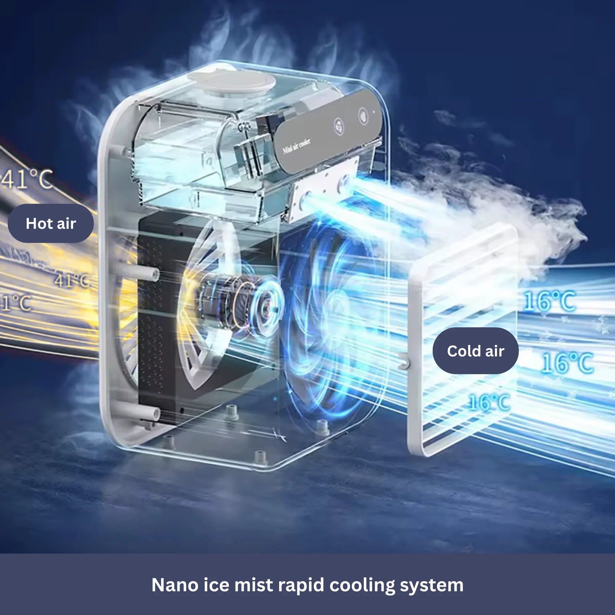 Thanks to Nano Ice Mist technology, the cooler can lower the air temperature at the outlet by up to 20°C (36°F) compared to the room temperature. Although exact results may vary depending on humidity and environmental conditions, users often feel a noticeable drop from 35°C to around 15°C directly in front of the device.