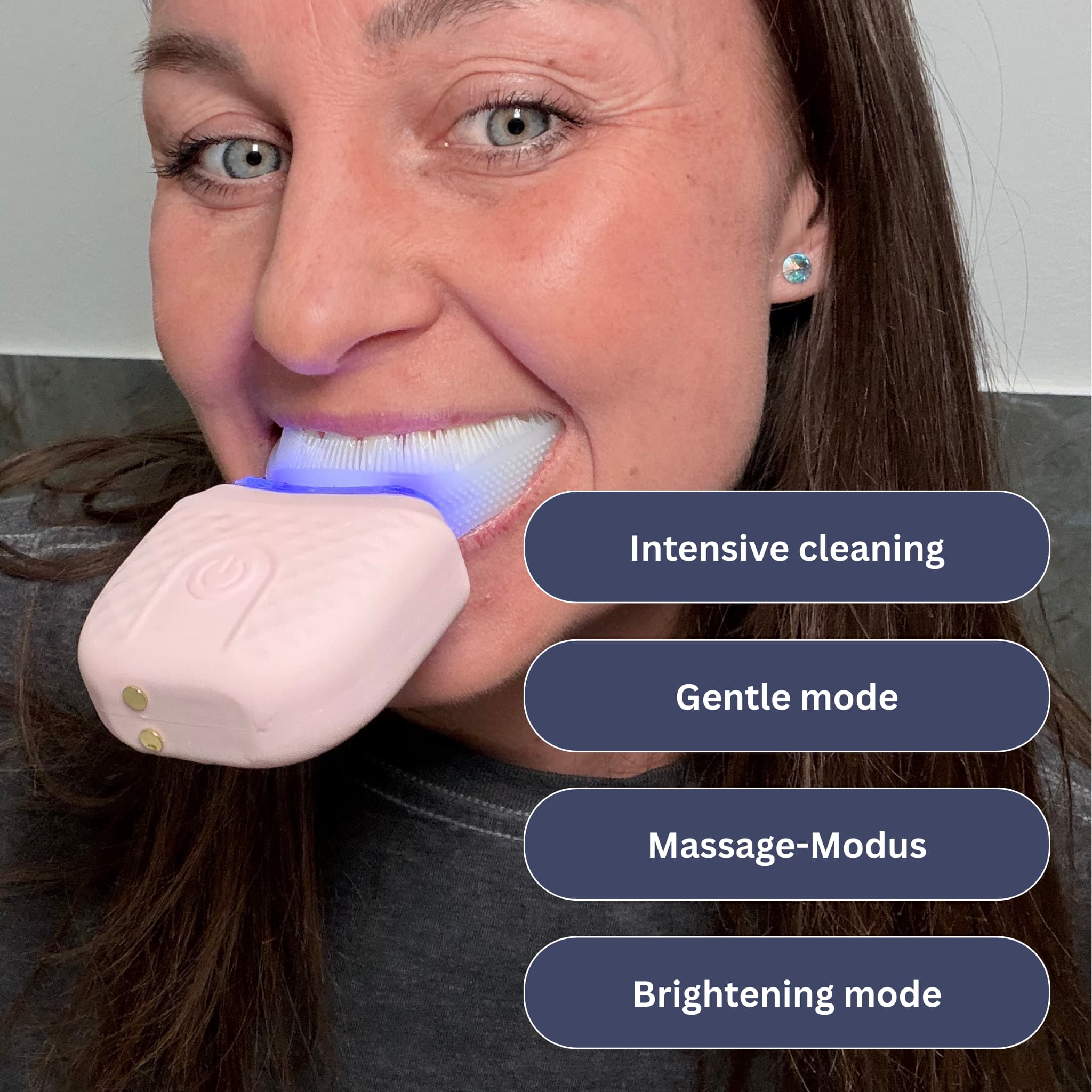 The built-in blue LED light supports teeth whitening, while the 360-degree cleaning reaches all areas.