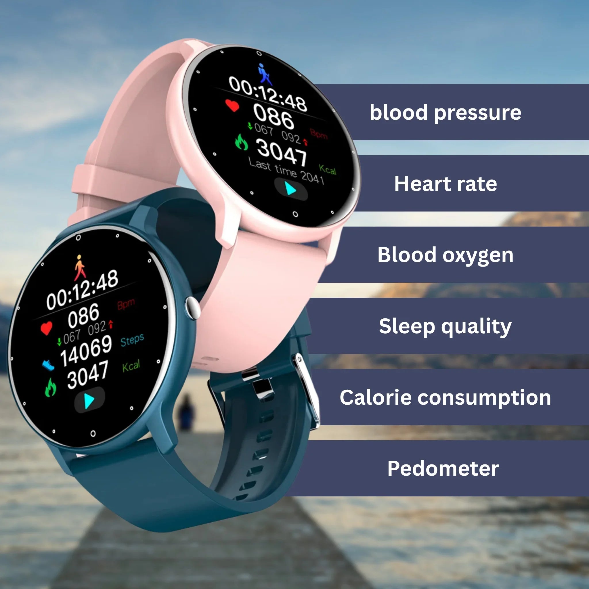 With the latest sensor technology, it continuously tracks your heart rate, blood oxygen level (SpO₂), and blood pressure.